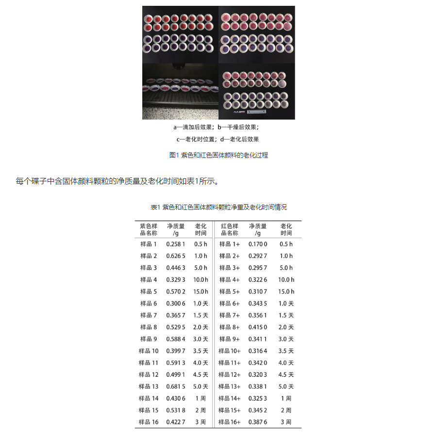 根据文献[5]报道的方法,利用苏木染铅白(即碱式碳酸铅)制备紫色和红色有机颜料。紫色颜料采用苏木直接染色法,红色颜料的制备是在苏木染色铅白的过程中加入明矾调节而成。取16.026 3 g紫色有机颜料,溶解到50 mL去离子水中,超声30 min使悬浊液均匀分布,用滴管分别滴加到16个白色小碟子里,每个滴加2.5 mL。取14.106 8 g红色有机颜料溶解到40 mL去离子水中,超声30 min使悬浊液均匀分布,用滴管分别滴加到16个白色小碟子里,每个滴加2.5 mL。滴加后效果、干燥后效果、老化时位置、老化后效果分别如图1所示。