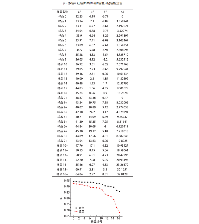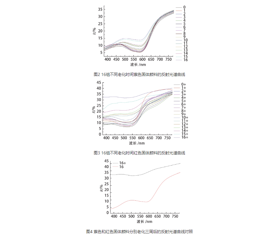在进行老化实验时,我们发现老化4天后,紫色和红色固体颜料开始产生褪色现象,褪色效果逐渐变得明显,3周后,两组老化样品已基本接近成铅白本白的颜色。古代铅白是一种常见的白色颜料,也存在变色的现象[8]。但在本次实验中,铅白老化并没有变黑,可能是由于大气环境下硫浓度影响并不显着,并且如果是硫的因素影响铅白,化学反应产生硫化铅,反射吸收系数应该是下降的,而实验总体结果是反射系数呈上升趋势,因此,铅白对整体产生颜色的影响因素可忽略。